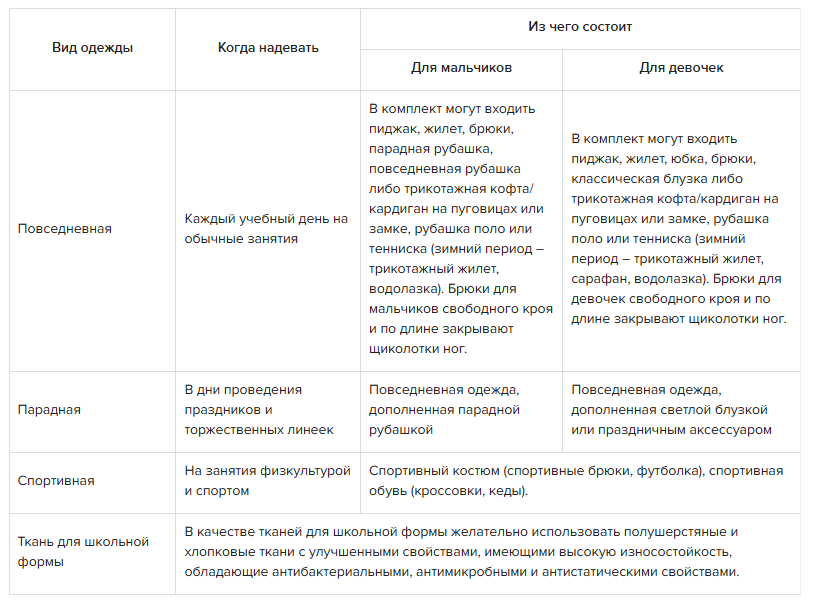 Внешний вид. Согласно требованиям Минпросвещения следует ввести три вида одежды учеников: повседневную, парадную и спортивную. Подробнее – в таблице.