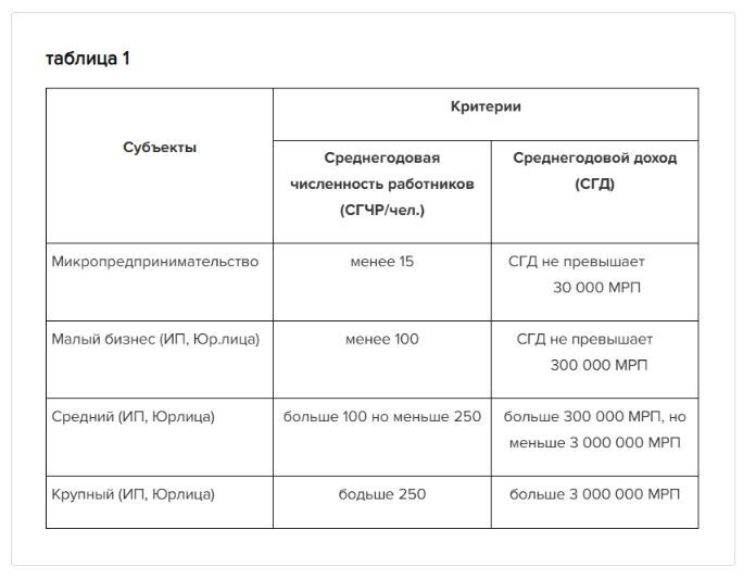 - табличка классификации субъекта по размерам (микро, малый, средний, крупный) – чтобы определить категорию бизнеса (таблица 1),