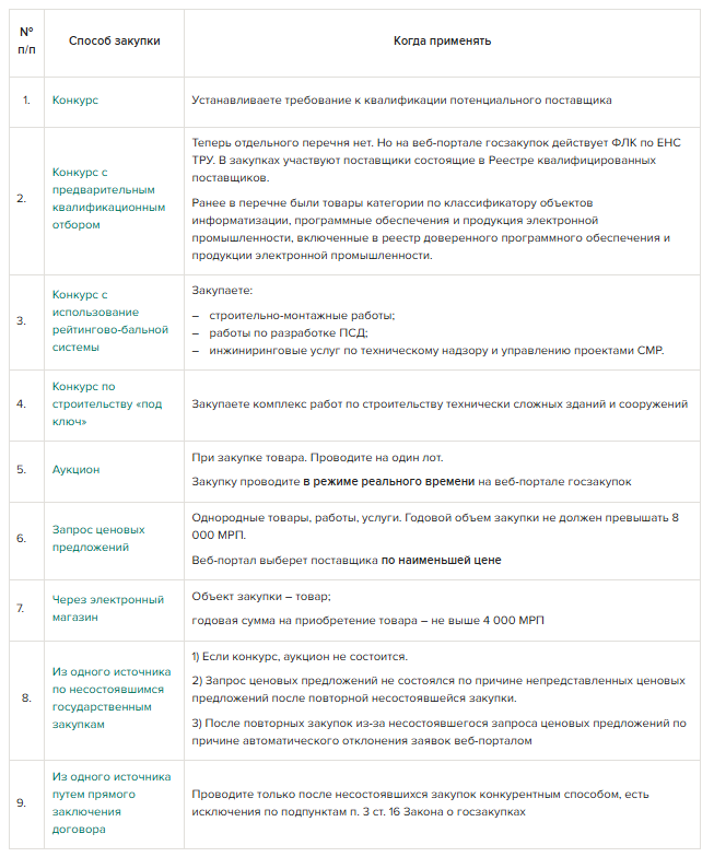 Таблица «Способы госзакупок» с 1 января 2025 года