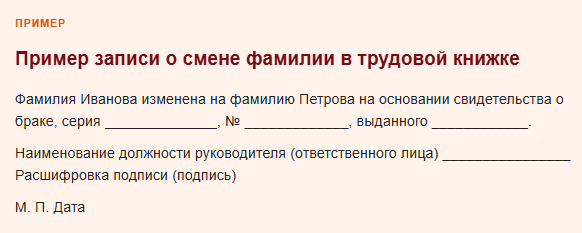 Таким образом, на основании заявления работника об изменении фамилии издайте приказ и внесите изменения в трудовой договор. Дополнительное соглашение составляется в свободной форме. Обычно для его составления используют форму договора (преамбула, текст, подписи сторон). Кроме того, вносятся также изменения в трудовую книжку.