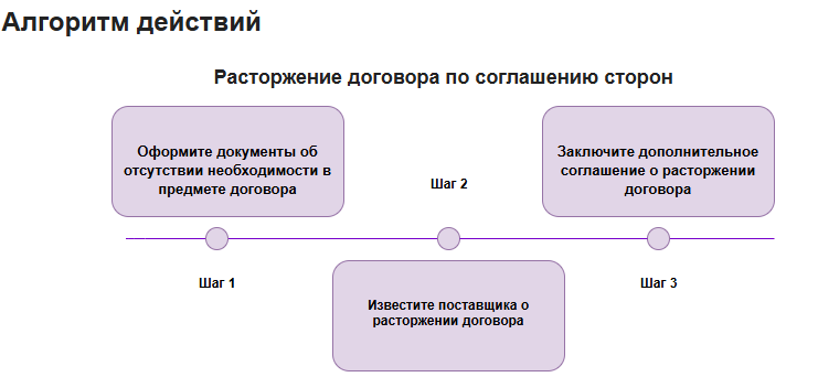 Шаг 1. Подготовьте документы, доказывающие отсутствие необходимости в предмете договора. Это может быть служебная записка, приказ руководства и т. п. Иначе при обращении поставщика в суд вы можете проиграть и суд может вынести решение о незаконном расторжении договора.