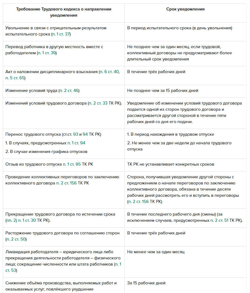 Не позднее чем за 15 календарных дней работодатель обязан уведомить работника об изменении условий труда, произошедшем по причинам, указанным в п. 1 ст. 46, если трудовой, коллективный договоры не предусматривают более длительный срок уведомления (п. 2 ст. 46 ТК РК).
