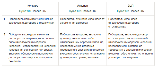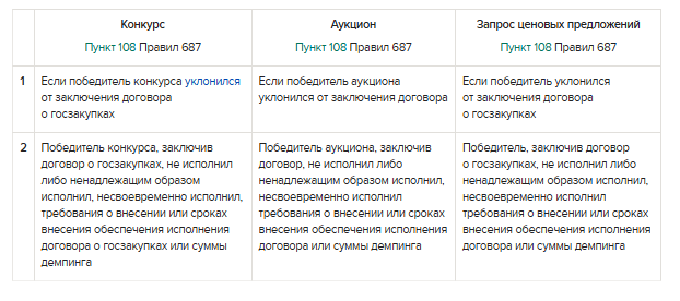 Сумму обеспечения заявки из электронного кошелька поставщика веб-портал блокирует автоматически в случаях нарушения поставщиком норм правил по госзакупкам. Случаи удержания суммы обеспечения заявки указаны в таблице.