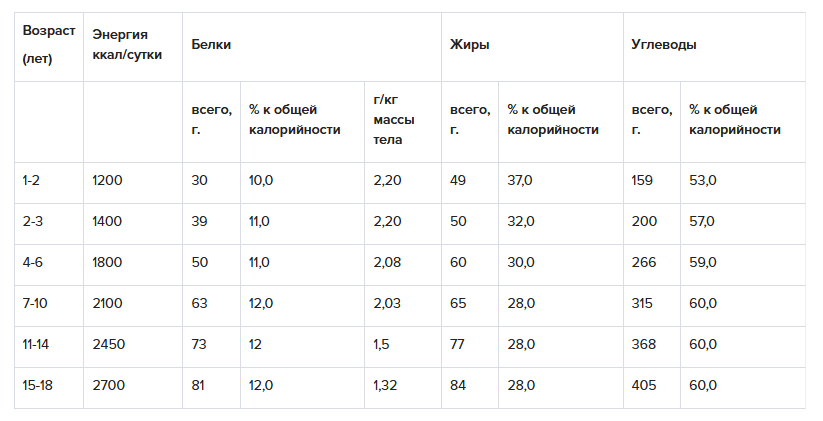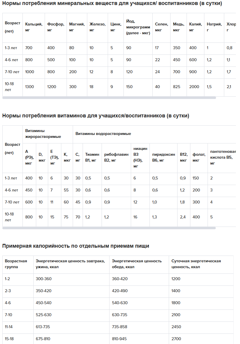 Нормы потребления энергии, белков, жиров и углеводов для учащихся/ воспитанников (в сутки)