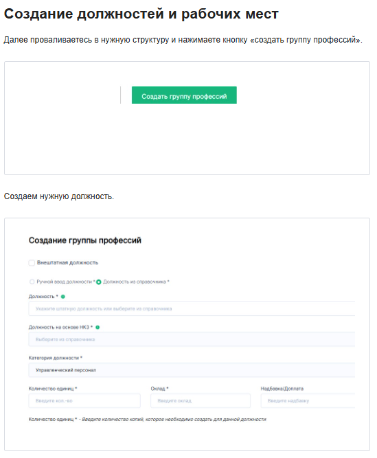 - «Количество единиц» – обязательное поле для заполнения, значение вводится вручную. Количество единиц определяет сколько рабочих мест в группе профессий.