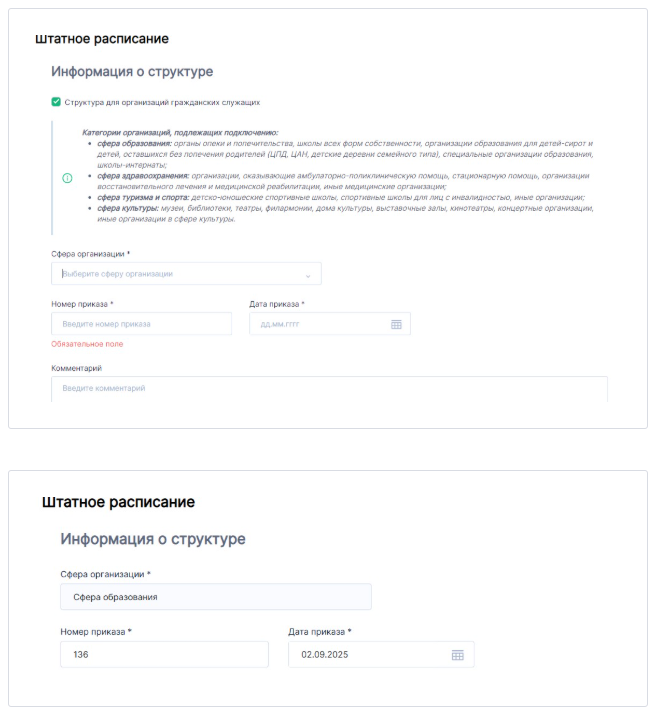 При необходимости заполните поле «Комментарий», добавив пояснения или текст самого приказа (например: «Приказ об утверждении штатного расписания № 136 от 02.09.2025 г.»).