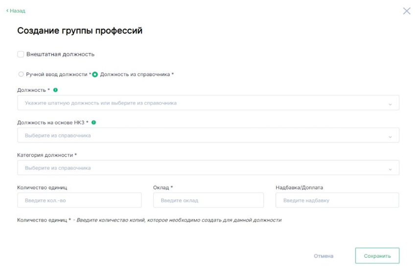 - «Количество единиц» – обязательное поле для заполнения, значение вводится вручную. Количество единиц определяет сколько рабочих мест в группе профессий.