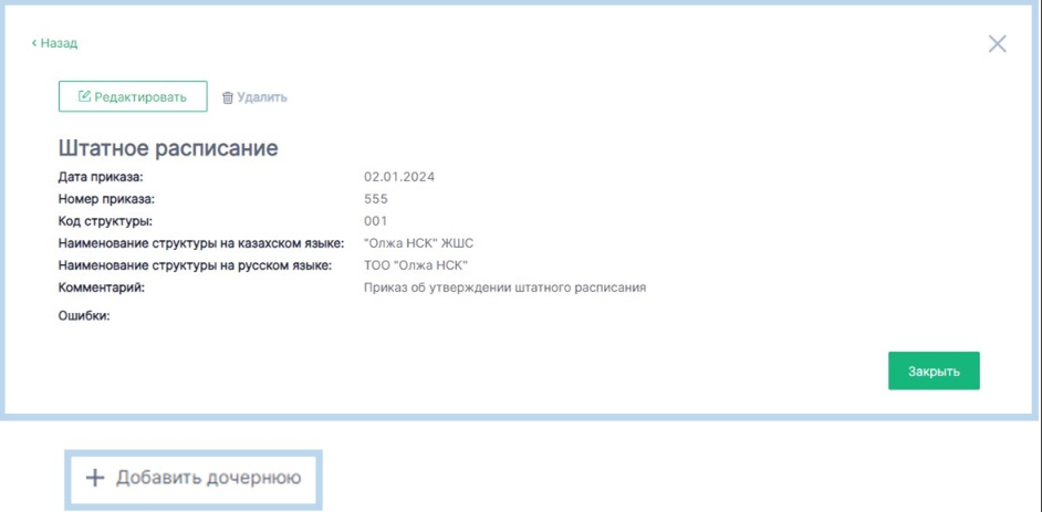 При выборе пункта «Смотреть», отображается форма введенных данных верхнего уровня структуры организации с возможностью редактирования и удаления: