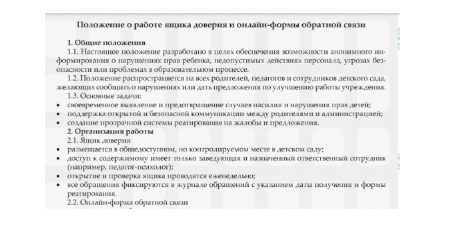 В каждой организации должна действовать анонимная линия обратной связи: «Ящик доверия» в доступном месте или электронная форма на сайте детского сада. Через нее родители могут сообщить о любых тревожных сигналах: грубость со стороны персонала, равнодушие, некорректные высказывания, изменения в поведении ребенка.