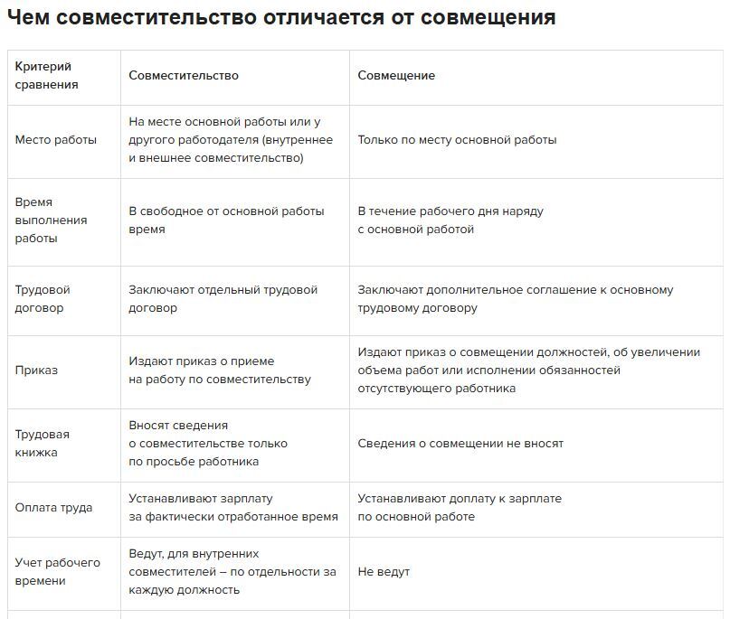 Не всегда объем работы на определенной должности требует привлечения работника на полную занятость. Выходом в этом случае может стать прием на работу совместителя или поручение работнику совмещения должностей. Несмотря на похожее звучание между совместительством и совмещением есть существенная разница.