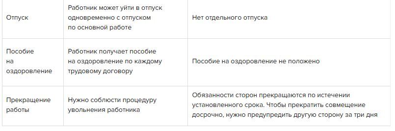 Совместительство – это выполнение работником трудовой функции в свободное от основной работы время. Оформляют работу по совместительству отдельным трудовым договором, в котором указывают, что работа не является основной. Совместительство может быть внутренним, когда работа по совместительству и основная работа выполняется у одного работодателя, и внешним – если работы ведутся у разных работодателей.