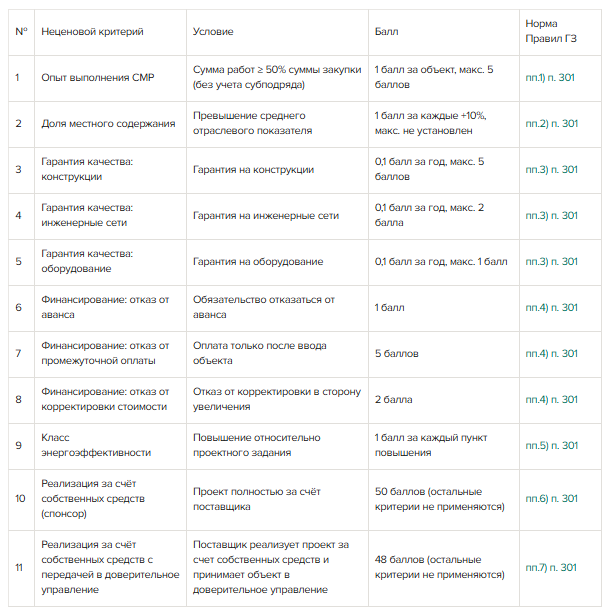 Конкурсная комиссия определяет победителя на основе сравнения неценовых критериев, влияющих на итоговую оценку заявок (п.302 Правил ГЗ).