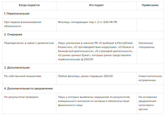Декларация об активах и обязательствах физического лица подразделяется на четыре вида, каждый из которых имеет свои особенности и основания для представления (п. 6 ст. 630 НК РК):