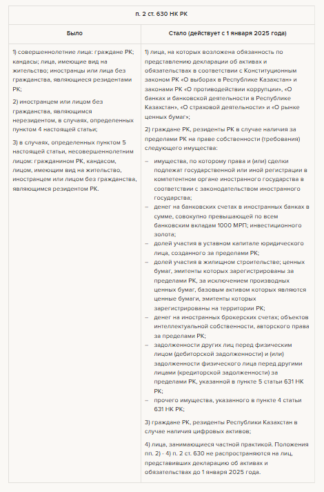 В соответствии с Законом РК от 15.07.25 г. № 208-VIII ст. 630 НК РК дополнена п. 5-2 (введен в действие с 1 января 2025 г.), который усиливает механизм налогового контроля за имуществом граждан в рамках Всеобщего декларирования.
