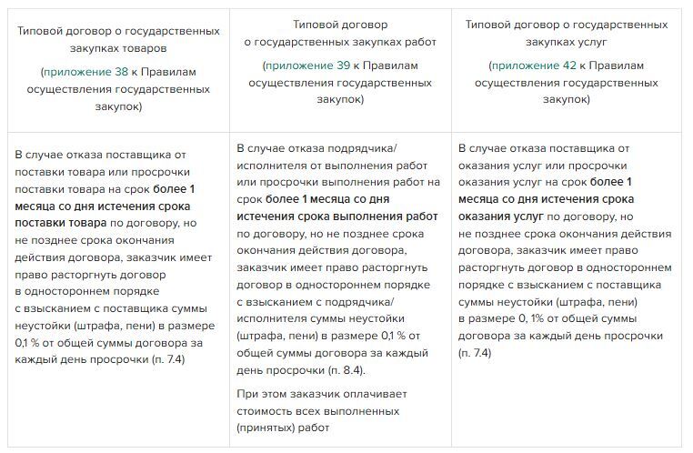 Размер неустойки для всех договоров о госзакупках одинаковые. Предел неустойки не более 15 % от суммы договора, кроме договоров госзакупок товаров у отечественных производителей (ОТП). Для поставщиков из реестра ОТП предел неустойки 3% от общей суммы договора. В типовых договорах о госзакупках товаров, работ, услуг есть разница сроков одностороннего расторжения договора. Эта разница влияет на период расчета суммы неустойки при отказе от исполнения договора со стороны поставщика.