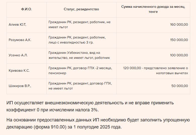 Так как среднемесячная заработная плата работников по итогам полугодия будет больше 23 МРП (в 2025 году: 23 × 3 932 = 90 436 тенге), то ИП может применить корректировку, предусмотренную п. 2 ст. 687 НК РК.