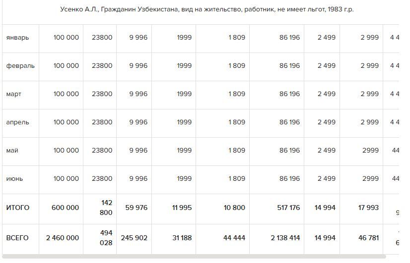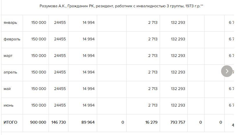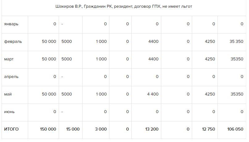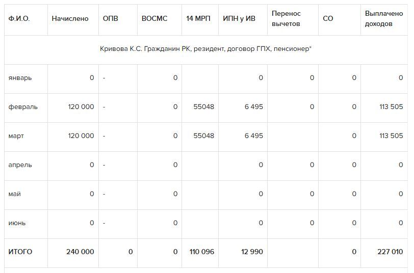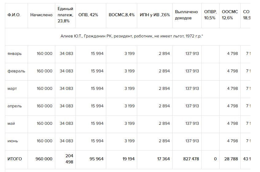*ОПВ, ОПВР, социальные отчисления, взносы ОСМС исчислены за 6 месяцев.
